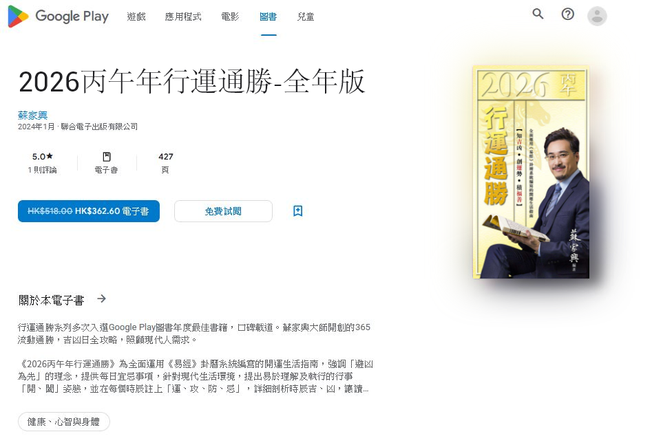 ( 留意:請務必選擇「圖書」,否則找不到《行運通勝》) - 3進入 Google Play 版面,在搜尋位輸入「2025乙巳年行運通勝」,便會找到此書籍